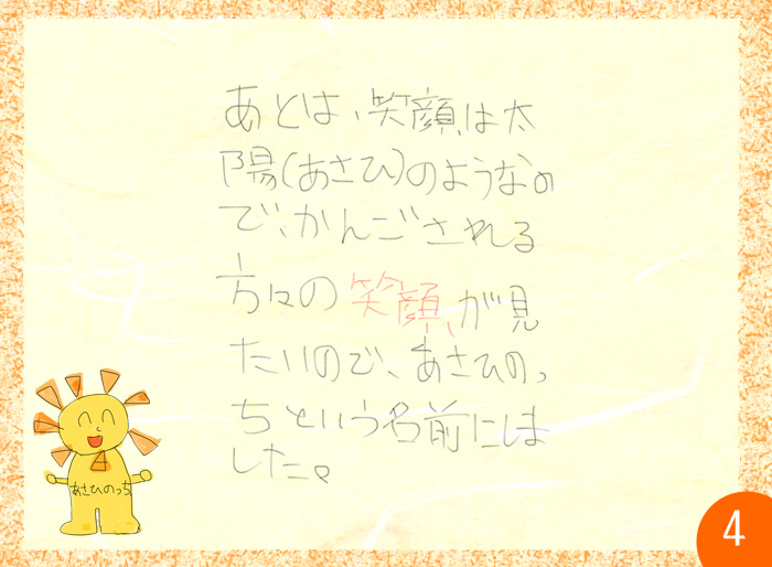 家族愛や地域への思いが詰まったキャラクターとして、あさひ介護センターの象徴になっています。